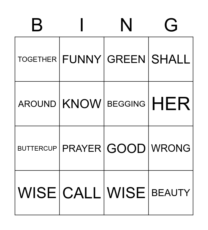 This bingo card has 16 words: CALL, WRONG, GREEN, TOGETHER, BUTTERCUP, FUNNY, GOOD, WISE, AROUND, KNOW, WISE, SHALL, PRAYER, HER, BEGGING and BEAUTY.