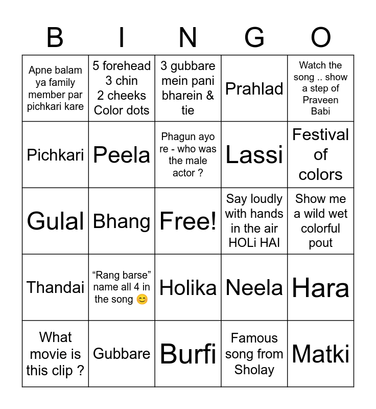 This bingo card has a free space and 24 words: What movie is this clip ?, “Rang barse” name all 4 in the song 😊, Phagun ayo re - who was the male actor ?, Famous song from Sholay, Watch the song .. show a step of Praveen Babi, Apne balam ya family member par pichkari kare, 5 forehead 3 chin 2 cheeks Color dots, 3 gubbare mein pani bharein & tie, Say loudly with hands in the air HOLi HAI, Show me a wild wet colorful pout, Gulal, Peela, Neela, Hara, Pichkari, Gubbare, Burfi, Prahlad, Festival of colors, Thandai, Bhang, Holika, Lassi and Matki.