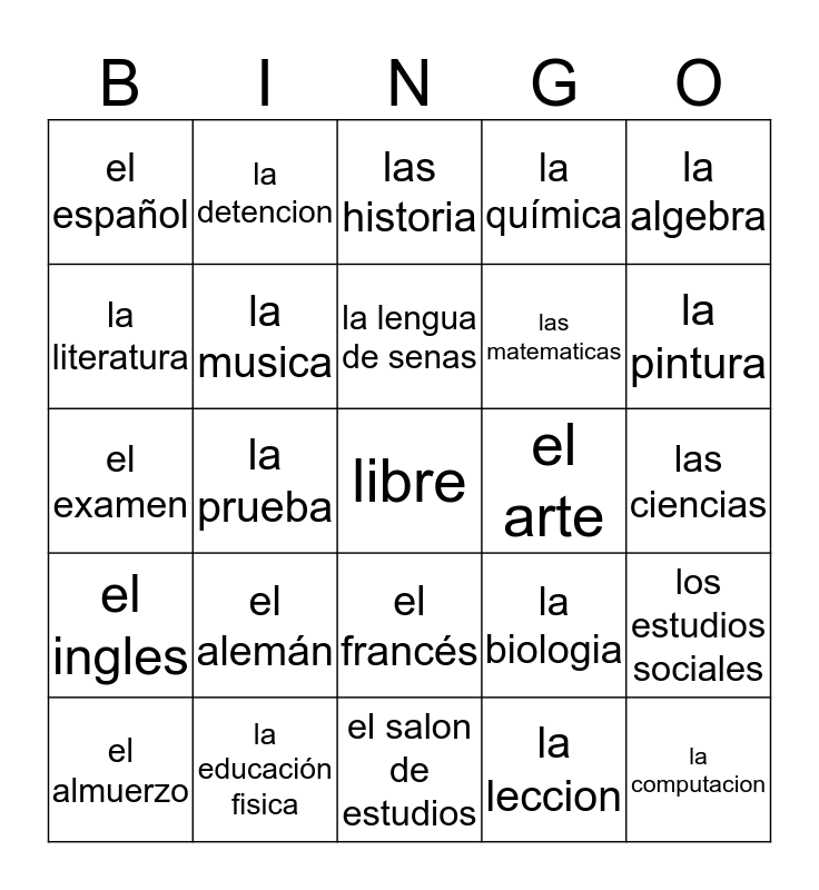 This bingo card has a free space and 24 words: el alemán, la educación fisica, la lengua de senas, el almuerzo, la algebra, el español, la literatura, la detencion, el arte, el francés, las matematicas, el examen, la biologia, los estudios sociales, la musica, la leccion, las ciencias, las historia, la pintura, la prueba, la computacion, el ingles, la química and el salon de estudios.