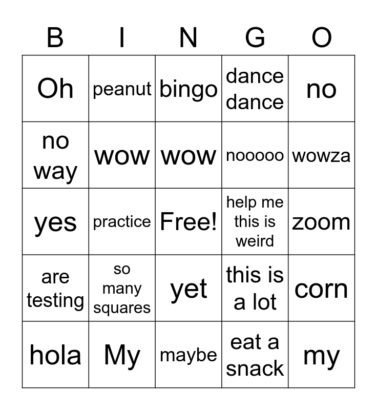 This bingo card has a free space and 62 words: Oh, My, gosh you, are testing, a bingo, board, wow, oh my, nooooo, wooo hoo, dance dance, Wowie, no way, howdy, monch, Oh, my, no, way, wow, help me this is weird, bingo, hola, eat a snack, party, dance, sing, flower, corn, potato, snack, lunch, dinner, yell, zoom, peanut, thirsty, coffee, practice, nooooo, yes, is this working, so many squares, help me, wowza, this is a lot, may as well, are, we, there, yet, maybe, I hope, maybe not, I will, keep, going, until, I think its, good to go, maybe and this is annoying.