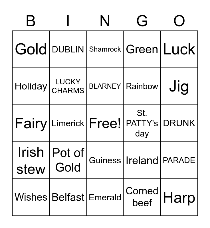 This bingo card has a free space and 50 words: MARCH, Harp, GAELIC, Emerald, Pot of Gold, ST.PATRICK, DUBLIN, Cabbage, Holiday, IRISH, LUCKY CHARMS, Green, PARADE, Ireland, Green water, Clover, BLARNEY, St. PATTY's day, Lepre-chaun, Luck, Limerick, Corned beef, Gold, Rainbow, Celtic, Irish, Jig, MARCH 17, Shamrock, Guiness, Pint, Friends, Magical, Pub, Belfast, Slante, LAD, Lass, Shenanigans, DRUNK, Kiss me I'm irish, Fiddle, Top hat, Bagpipes, Wishes, Fairy, Irish whiskey, Irish cream, Irish stew and Snakes.