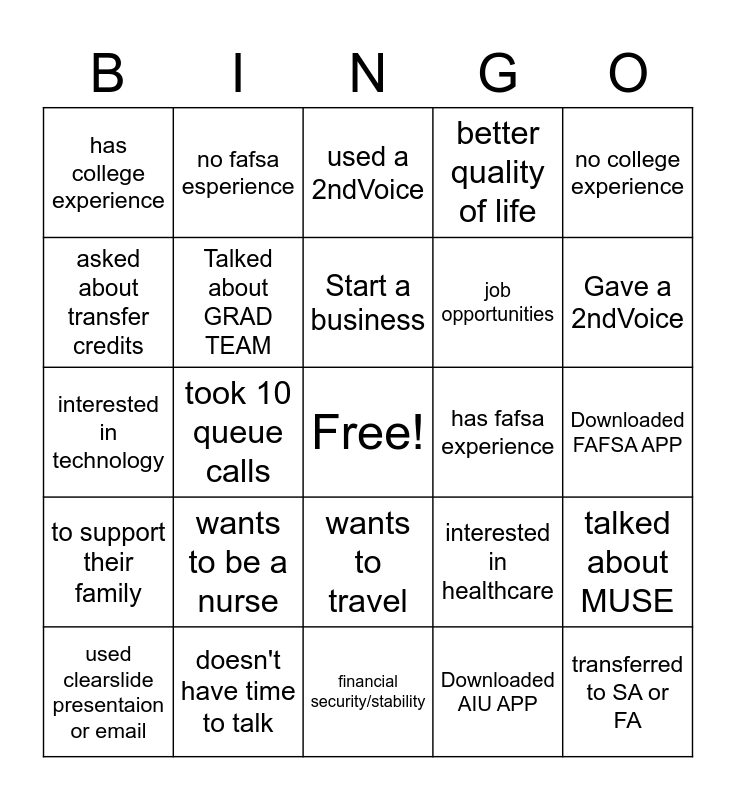 This bingo card has a free space and 24 words: wants to be a nurse, doesn't have time to talk, Start a business, used clearslide presentaion or email, no college experience, has college experience, asked about transfer credits, no fafsa esperience, has fafsa experience, wants to travel, job opportunities, interested in technology, interested in healthcare, talked about MUSE, Talked about GRAD TEAM, Downloaded AIU APP, Downloaded FAFSA APP, used a 2ndVoice, Gave a 2ndVoice, took 10 queue calls, transferred to SA or FA, to support their family, better quality of life and financial security/stability.