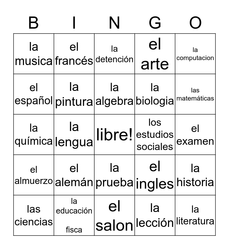 This bingo card has a free space and 24 words: el alemán, la educación fisca, la algebra, las ciencias, la computacion, la musica, el español, el francés, los estudios sociales, la prueba, la biologia, la química, el ingles, la historia, la pintura, la lección, el examen, la detención, las matemáticas, la lengua, la literatura, el almuerzo, el arte and el salon.