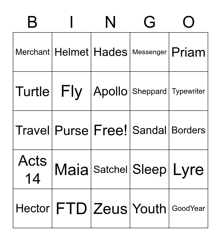 This bingo card has a free space and 25 words: Maia, Zeus, Apollo, Hector, Priam, Merchant, Turtle, Helmet, Sandal, Satchel, Sheppard, Travel, Sleep, Lyre, Fly, Speed, Borders, Hades, Typewriter, Purse, GoodYear, FTD, Acts 14, Messenger and Youth.
