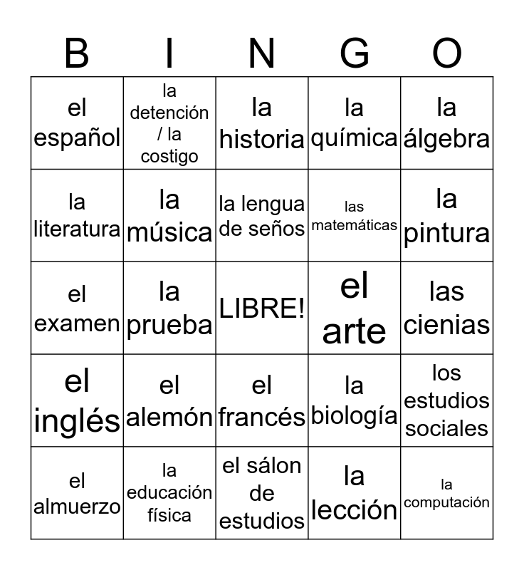 This bingo card has a free space and 24 words: el alemón, la educación física, la lengua de seños, el almuerzo, la álgebra, el español, la literatura, la detención / la costigo, el arte, el francés, las matemáticas, el examen, la biología, los estudios sociales, la música, la lección, las cienias, la historia, la pintura, la prueba, la computación, el inglés, la química and el sálon de estudios.