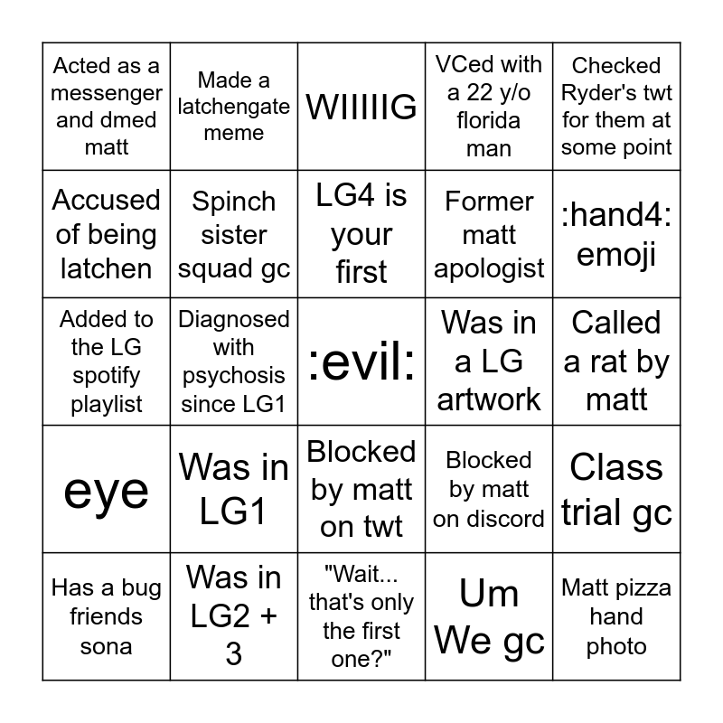 This bingo card has a free space and 24 words: Was in LG1, Was in LG2 + 3, LG4 is your first, Has a bug friends sona, Checked Ryder's twt for them at some point, Acted as a messenger and dmed matt, Accused of being latchen, Made a latchengate meme, Was in a LG artwork, Blocked by matt on twt, Former matt apologist, Added to the LG spotify playlist, Blocked by matt on discord, Class trial gc, Spinch sister squad gc, Um We gc, Called a rat by matt, WIIIIIG, :hand4: emoji, Diagnosed with psychosis since LG1, Matt pizza hand photo, eye, VCed with a 22 y/o florida man and "Wait... that's only the first one?".