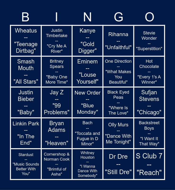 This bingo card has 25 words: Bryan Adams -- "Heaven", Whitney Houston -- "I Wanna Dance With Somebody", Eminem -- "Louse Yourself", Stardust -- "Music Sounds Better With You", Stevie Wonder -- "Superstition", Wheatus -- "Teenage Dirtbag", Smash Mouth -- "All Stars", Justin Timberlake -- "Cry Me A River", Black Eyed Peas -- "Where Is The Love", Bach -- "Toccata and Fugue in D Minor", One Direction -- "What Makes You Beautiful", Justin Bieber -- "Baby", Olly Murs -- "Dance With Me Tonight", Backstreet Boys -- "I Want It That Way", Britney Spears -- "Baby One More Time", S Club 7 -- "Reach", Sufjan Stevens -- "Chicago", Kanye -- "Gold Digger", Hot Chocolate -- "Every 1's A Winner", Jay Z -- "99 Problems", New Order -- "Blue Monday", Cornershop & Norman Cook -- "Brimful of Asha", Linkin Park -- "In The End", Rihanna -- "Unfaithful" and Dr Dre -- "Still Dre".