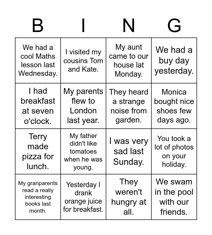This bingo card has 16 words: Yesterday I drank orange juice for breakfast., You took a lot of photos on your holiday., My aunt came to our house lat Monday., We had a cool Maths lesson last Wednesday., Terry made pizza for lunch., I visited my cousins Tom and Kate., I was very sad last Sunday., They weren't hungry at all., I had breakfast at seven o'clock., My parents flew to London last year., My granparents read a really interesting books last month., We had a buy day yesterday., My father didn't like tomatoes when he was young., Monica bought nice shoes few days ago., They heard a strange noise from garden. and We swam in the pool with our friends..
