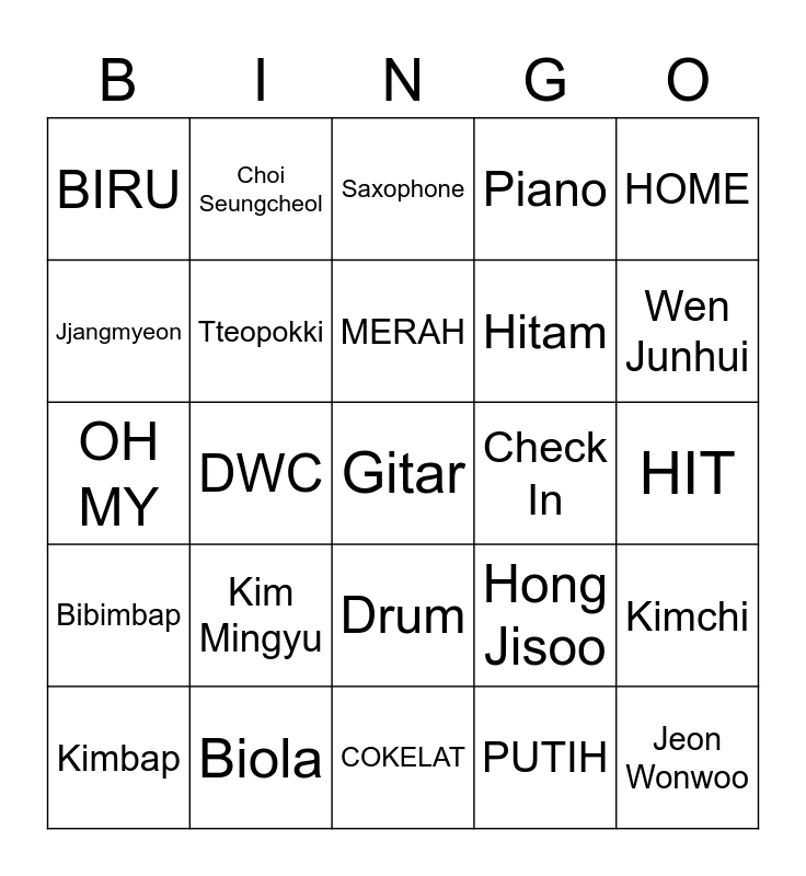 This bingo card has a free space and 24 words: Kim Mingyu, Biola, MERAH, Kimbap, HOME, BIRU, Jjangmyeon, Choi Seungcheol, Check In, Drum, Hitam, OH MY, Hong Jisoo, Kimchi, Tteopokki, PUTIH, HIT, Saxophone, Wen Junhui, DWC, Jeon Wonwoo, Bibimbap, Piano and COKELAT.