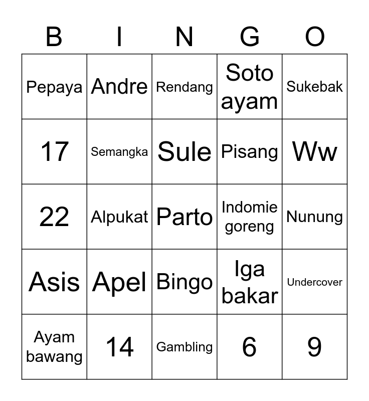 This bingo card has a free space and 24 words: Apel, 14, Sule, Ayam bawang, Sukebak, Pepaya, 17, Andre, Indomie goreng, Bingo, Pisang, 22, Iga bakar, Undercover, Semangka, 6, Nunung, Rendang, Ww, Alpukat, 9, Asis, Soto ayam and Gambling.
