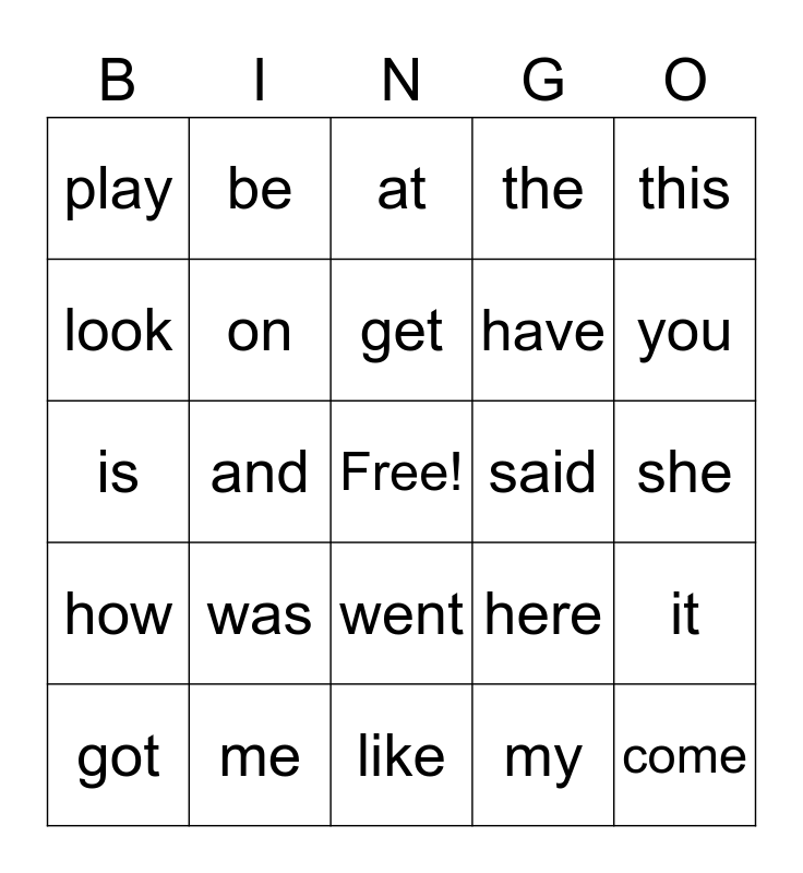 This bingo card has a free space and 39 words: did, up, fun, on, got, went, get, am, this, how, and, the, come, she, said, was, are, play, for, here, look, like, have, you, see, he, can, do, to, be, we, go, at, me, my, me, it, is and in.