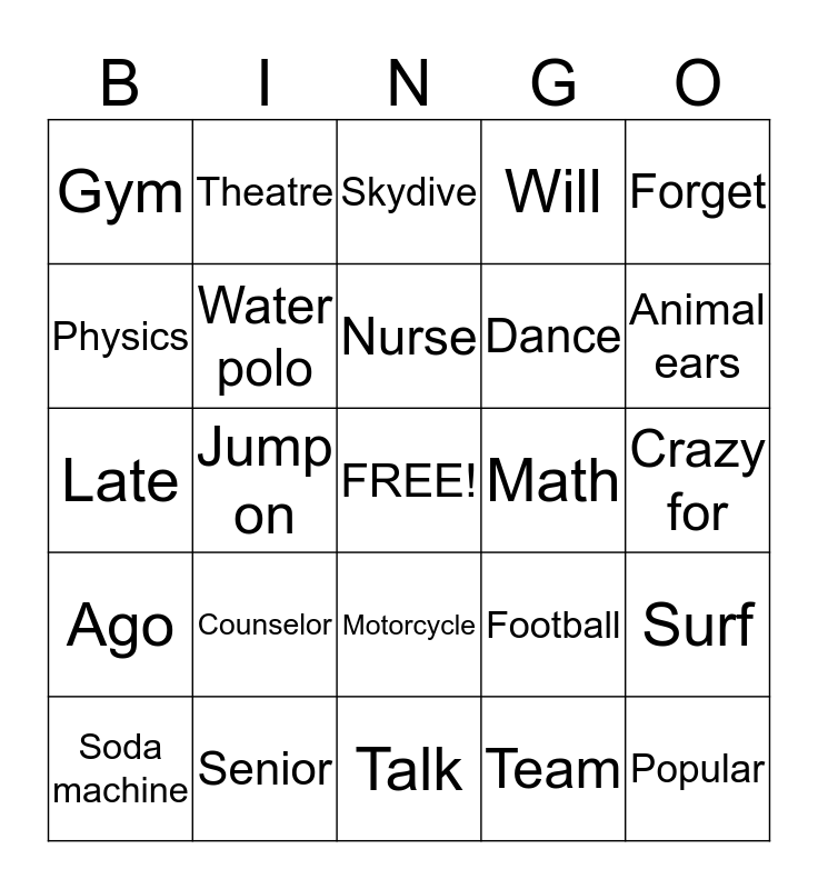 This bingo card has a free space and 24 words: Counselor, Senior, Nurse, Soda machine, Forget, Gym, Physics, Theatre, Math, Motorcycle, Dance, Late, Football, Surf, Water polo, Team, Crazy for, Skydive, Animal ears, Jump on, Popular, Ago, Will and Talk.