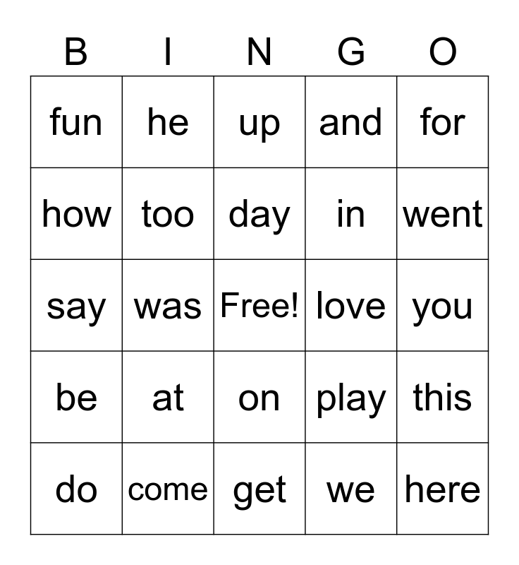 This bingo card has a free space and 24 words: at, come, day, do, for, fun, how, he, love, on, in, say, play, this, too, we, you, up, went, was, here, be, and and get.