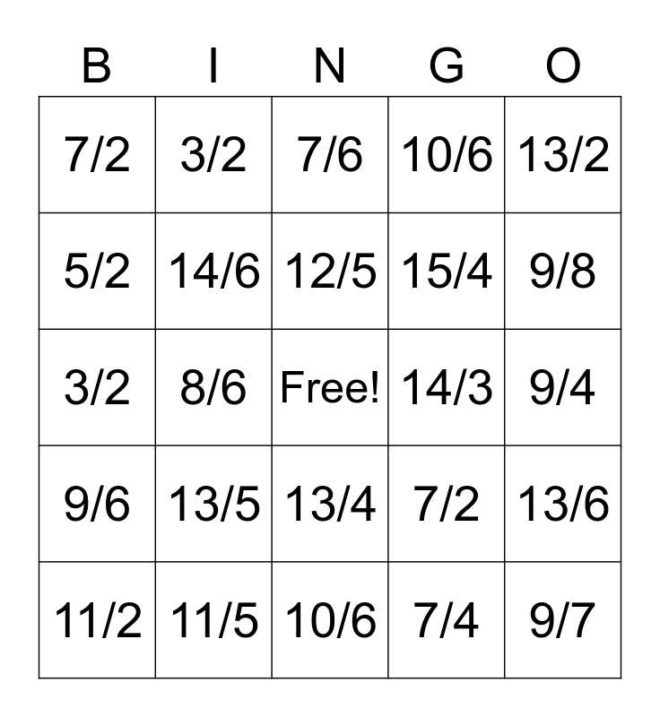 This bingo card has a free space and 24 words: 13/5, 11/5, 12/5, 11/2, 13/2, 7/2, 5/2, 3/2, 14/3, 13/4, 15/4, 3/2, 7/2, 13/6, 14/6, 7/4, 9/4, 7/6, 9/8, 8/6, 9/7, 9/6, 10/6 and 10/6.
