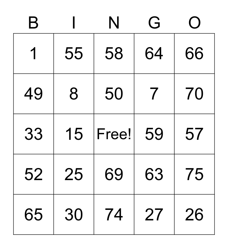 This bingo card has a free space and 24 words: 25, 30, 50, 65, 66, 1, 49, 55, 59, 69, 7, 33, 63, 75, 8, 27, 57, 58, 70, 15, 26, 52, 64 and 74.