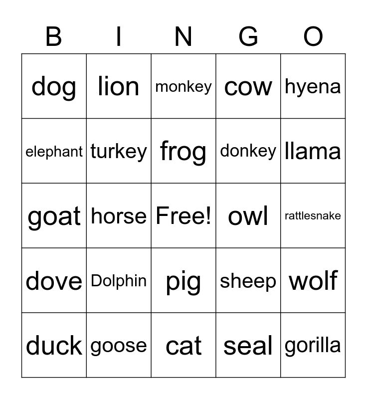 This bingo card has a free space and 24 words: Dolphin, goose, frog, duck, hyena, dog, elephant, lion, owl, pig, donkey, goat, sheep, wolf, turkey, seal, rattlesnake, monkey, llama, horse, gorilla, dove, cow and cat.