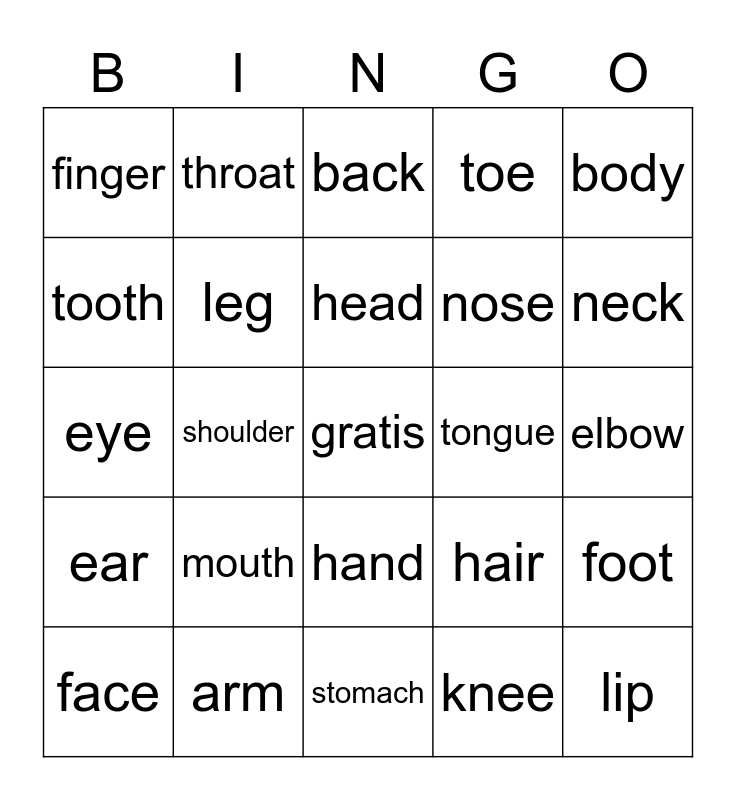 This bingo card has a free space and 24 words: mouth, arm, head, face, body, finger, tooth, throat, tongue, hand, nose, eye, hair, foot, leg, knee, elbow, back, neck, shoulder, lip, ear, toe and stomach.