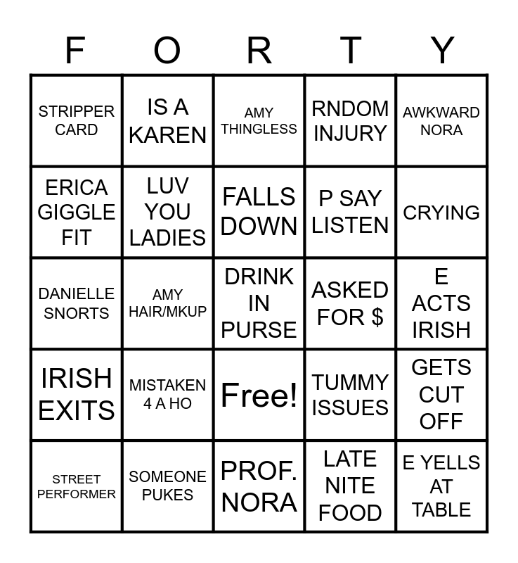 This bingo card has 26 words: Free!, LATE NITE FOOD, FALLS DOWN, SOMEONE PUKES, AWKWARD NORA, STRIPPER CARD, ERICA GIGGLE FIT, IS A KAREN, E ACTS IRISH, TUMMY ISSUES, P SAY LISTEN, DANIELLE SNORTS, GETS CUT OFF, STREET PERFORMER, AMY HAIR/MKUP, WANTS OT DANCE, RNDOM INJURY, IRISH EXITS, AMY THINGLESS, DRINK IN PURSE, CRYING, PROF. NORA, ASKED FOR $, MISTAKEN 4 A HO, LUV YOU LADIES and E YELLS AT TABLE.