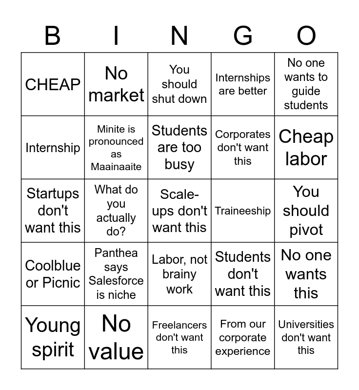 This bingo card has a free space and 24 words: Panthea says Salesforce is niche, No value, Students are too busy, Young spirit, No one wants to guide students, CHEAP, Internship, No market, Traineeship, Labor, not brainy work, Corporates don't want this, Startups don't want this, Students don't want this, No one wants this, Minite is pronounced as Maainaaite, From our corporate experience, You should pivot, You should shut down, Cheap labor, What do you actually do?, Universities don't want this, Coolblue or Picnic, Internships are better and Freelancers don't want this.