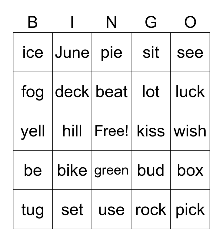 This bingo card has a free space and 40 words: bed, yell, yes, deck, set, green, beat, hear, see, be, hill, sit, pick, wish, kiss, bike, ride, ice, kite, pie, box, rock, lot, fog, doll, boat, hope, bow, home, oak, run, tug, cub, bud, luck, use, tube, blue, June and cube.