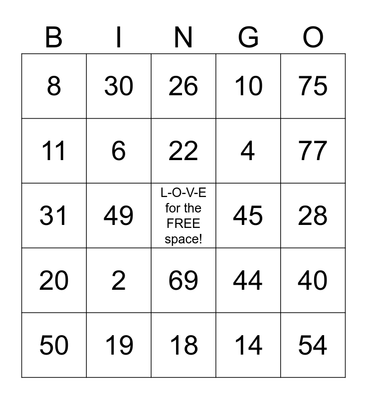 This bingo card has a free space and 24 words: 2, 19, 22, 50, 75, 8, 11, 30, 45, 69, 4, 31, 44, 40, 6, 14, 28, 26, 77, 49, 54, 20, 10 and 18.