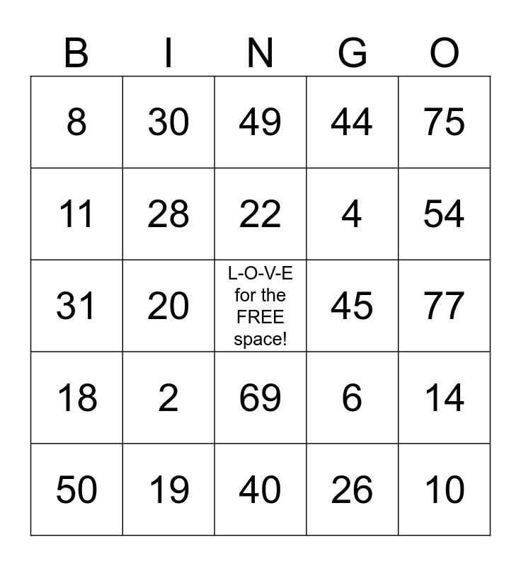 This bingo card has a free space and 24 words: 2, 19, 22, 50, 75, 8, 11, 30, 45, 69, 4, 31, 6, 14, 28, 26, 77, 49, 54, 20, 10, 18, 44 and 40.