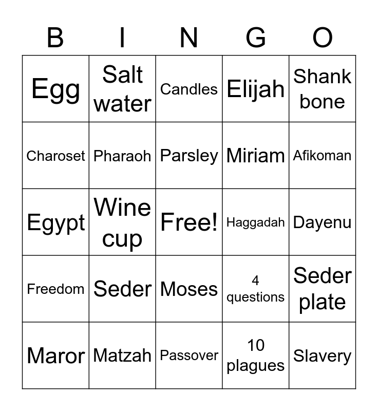 This bingo card has a free space and 24 words: Seder, Matzah, Parsley, Maror, Shank bone, Egg, Charoset, Salt water, Haggadah, Moses, Miriam, Egypt, 4 questions, Seder plate, Pharaoh, 10 plagues, Dayenu, Candles, Afikoman, Wine cup, Slavery, Freedom, Elijah and Passover.