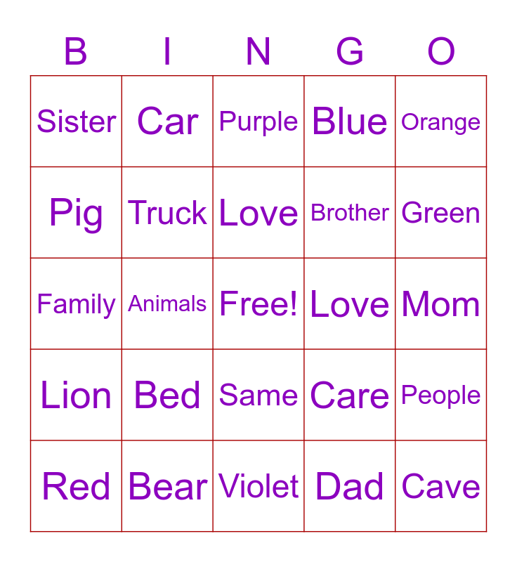 This bingo card has a free space and 24 words: Bed, Bear, Love, Red, Orange, Sister, Pig, Car, Love, Same, Brother, Family, Care, People, Truck, Dad, Mom, Purple, Green, Animals, Cave, Lion, Blue and Violet.
