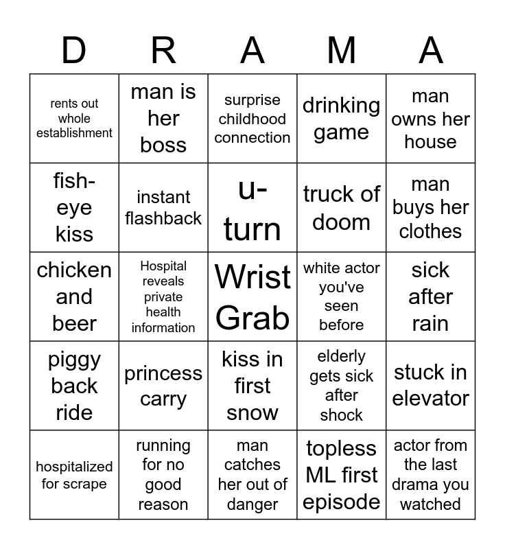 This bingo card has a free space and 26 words: kiss in first snow, topless ML first episode, u-turn, running for no good reason, man owns her house, rents out whole establishment, fish-eye kiss, man is her boss, sick after rain, elderly gets sick after shock, truck of doom, chicken and beer, stuck in elevator, hospitalized for scrape, Hospital reveals private health information, "that kiss was just a greeting", drinking game, piggy back ride, surprise childhood connection, actor from the last drama you watched, man buys her clothes, man catches her out of danger, white actor you've seen before, princess carry, instant flashback and Cheesy English line in the OST.