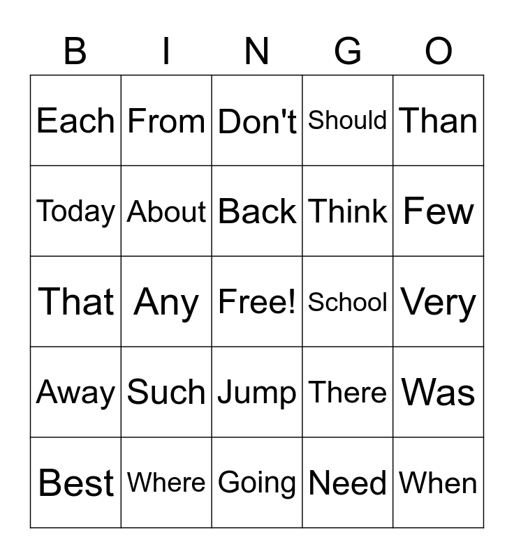 This bingo card has a free space and 25 words: Such, Going, Back, Best, Than, Each, Today, From, School, Jump, Think, That, There, Was, About, With, Very, Don't, Few, Any, When, Where, Away, Should and Need.