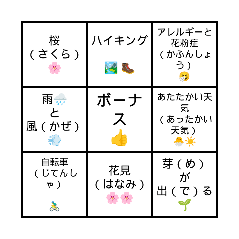 This bingo card has a free space and 8 words: あたたかい天気 (あったかい 天気) 🐣☀️, アレルギーと花粉症 (かふんしょう) 🤧, ハイキング 🏞 🥾, 自転車 (じてんしゃ) 🚴♂️, 桜 (さくら) 🌸, 芽(め) が 出(で)る 🌱, 雨🌧 と 風(かぜ)💨 and 花見 (はなみ) 🌸🌸.