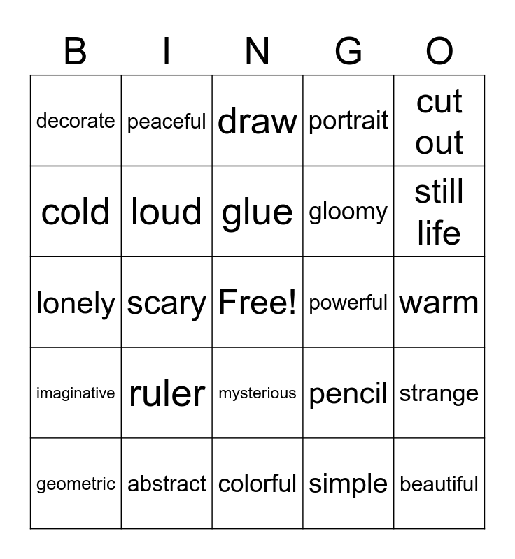 This bingo card has a free space and 34 words: bright, vivid, dark, dull, warm, cold, loud, colorful, gloomy, beautiful, lonely, peaceful, simple, relaxing, imaginative, scary, mysterious, powerful, strange, geometric, abstract, landscape, portrait, still life, shapes, ruler, draw, scissors, cut out, decorate, glue stick, glue, pencil and write.