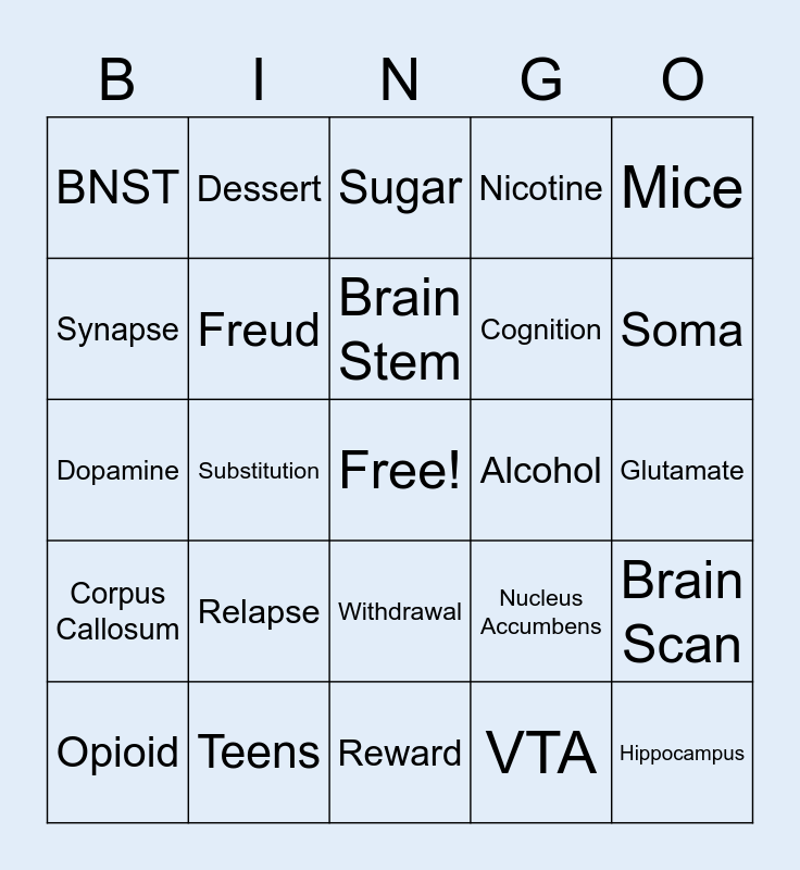 This bingo card has a free space and 45 words: Neuroplasticity, Hippocampus, Addiction, Opioid, Drugs, VTA, Sugar, Neurobiology, Mice, Teens, Nicotine, Alcohol, Withdrawal, Relapse, COVID-19, Reward, Reward System, Dopamine, Neuron, Soma, Dessert, Serotonin, Prefrontal Cortex, BNST, GABA, Glutamate, Receptors, Endorphins, Nucleus Accumbens, Corpus Callosum, Hallucinations, Brain Scan, EEG, Cravings, Disease, Substitution, Peer Support, Case Management, Neurotransmitter, Brain Stem, Synapse, Cognition, Phobia, Freud and Functionalism.