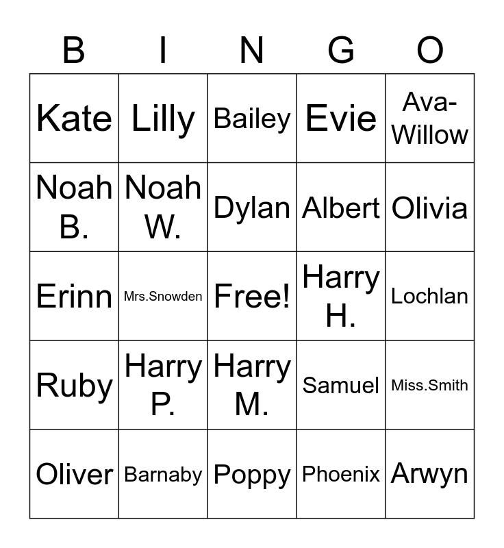 This bingo card has a free space and 34 words: Charlie, Phoenix, Lola, Bella, Ruby, Noah W., Ava-Willow, Oliver, Lilly, Jacob, Dylan, Bailey, Toby, Chloe, Harry H., Olivia, Barnaby, Erinn, Harry P., Samuel, Harry M., Finnley, Kate, Lochlan, Poppy, Arwyn, Evie, Kaleb, Albert, Noah B., Mr.Lowe, Mrs.Snowden, Miss.Smith and Mrs.Smith.