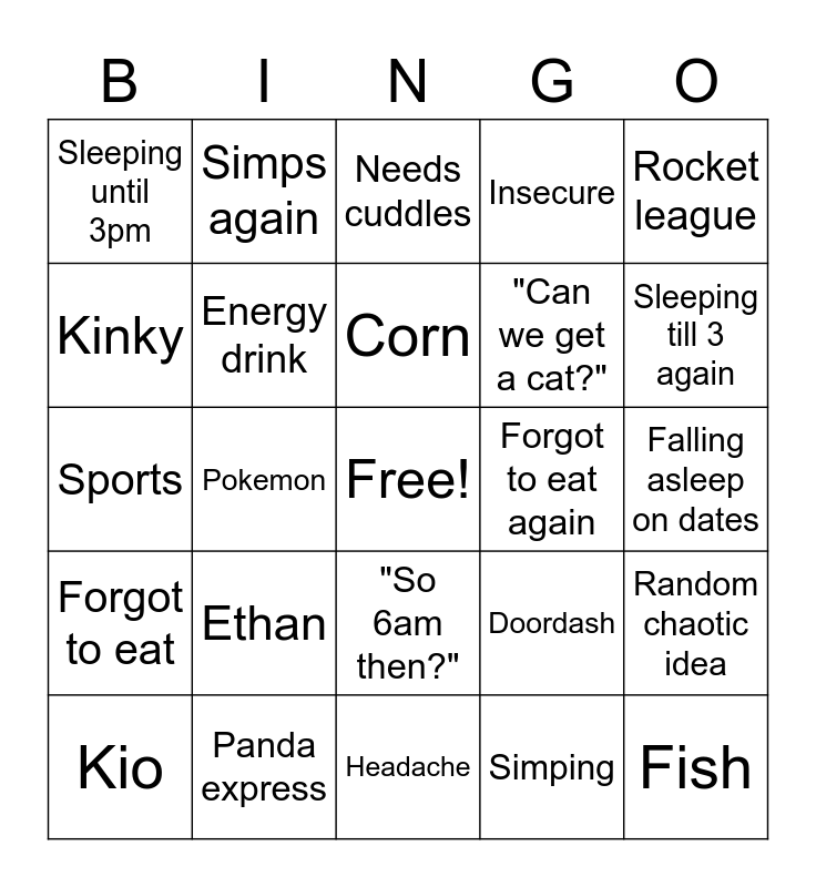 This bingo card has a free space and 24 words: Ethan, Panda express, Corn, Kio, Rocket league, Sleeping until 3pm, Kinky, Simps again, Forgot to eat again, "So 6am then?", "Can we get a cat?", Sports, Doordash, Random chaotic idea, Energy drink, Simping, Falling asleep on dates, Needs cuddles, Sleeping till 3 again, Pokemon, Fish, Forgot to eat, Insecure and Headache.