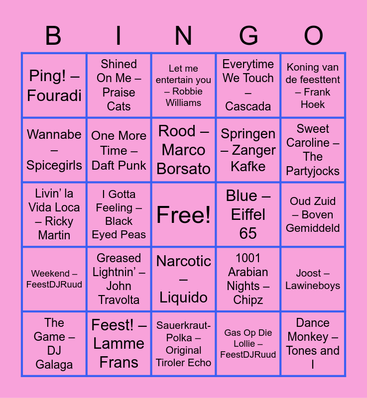 This bingo card has a free space and 77 words: Stupid – Tess, Vrij zijn – Marco Borsato, Let me entertain you – Robbie Williams, Oya Lélé – K3, Dromendans – Vinzzent, Radioactive – Warface, Bella – Jaman, Vamos a la Playa – Willem de Roo, Sterrenstof – De jeugd van tegenwoordig, Tijdmachine – Jeugd van tegenwoordig, Dakterras – Swifty Official, Gimme! Gimme! Gimme! – ABBA, Rood – Marco Borsato, Wannabe – Spicegirls, Single Ladies – Beyoncé, I Gotta Feeling – Black Eyed Peas, Survivor – Destiny’s Child, Dance Monkey – Tones and I, Viben – K-Liber, Koning van de feesttent – Frank Hoek, Broodje van Kootje – Barry Badpak, Livin’ la Vida Loca – Ricky Martin, One More Time – Daft Punk, Shined On Me – Praise Cats, Everytime We Touch – Cascada, We Gaan Raket Nu – Gerard Joling, Geboren Om Te Zuipen – DJ Cortizo, Swapfiets – Bandlek, Atje Voor De Sfeer – Rene Karst, Waanzin – Don Quichot, Gevallen – Raymon Hermas, Gezelligheid Kent Geen Spijt – Frans Duits, De Finale – Zanger Kafke, 1001 Arabian Nights – Chipz, Sweet Caroline – The Partyjocks, Springen – Zanger Kafke, Surf – Bam Bam Papi, Ferry de Roze Flamingo – Barry Fest, Oud Zuid – Boven Gemiddeld, Gas Op Die Lollie – FeestDJRuud, Helemaal Naar De Klote – The Partysquad, Hausa Wausa – Mr. Polska, Allermooiste Feestje – Yellow Claw, Vlammen – Mr. Polska, Blijf Je Vanavond – Monique Smit, Barbra Streisand – Duck Sauce, The Game – DJ Galaga, Ping! – Fouradi, I Don’t Like It, I Love It – Flo Rida, My House – Flo Rida, Hips Don’t Lie – Shakira, Narcotic – Liquido, Rainbow In The Sky – Paul Elstak, M’n Favoriet – Raymon Hermans, Waarom Dans Je Niet Met Mij – Wesley Klein, De Stad Amsterdam – Acda en de Munnik, Vol Gas!! – Feestlift, 100.000 Shotjes – Mr. Wonder, De Barman – Bestie, Danze Kuduro – Don Omar, Greased Lightnin’ – John Travolta, Als Een Komeet – Randy Watzeels, Vergeten -Feestteam, Hotel Room Service – Pitbull, Hey Baby – The Cooldown Café, Hangover – Taio Cruz, Destination Calabria – Alex Gaudino, Blue – Eiffel 65, La Bomba – King Africa, Lekker Pik – Buren van de brandweer, Casanova – Palm Trees, Joost – Lawineboys, Weekend – FeestDJRuud, Feest! – Lamme Frans, Mama Laudaaa – Almklausi, Sauerkraut-Polka – Original Tiroler Echo and Ein Prosit – Die Musikanten-Vagabunden.