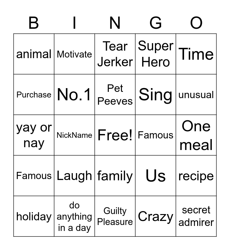 This bingo card has a free space and 24 words: Laugh, do anything in a day, Pet Peeves, holiday, Time, animal, Purchase, Motivate, Famous, family, Sing, yay or nay, Us, recipe, No.1, Crazy, One meal, Tear Jerker, unusual, NickName, secret admirer, Famous, Super Hero and Guilty Pleasure.