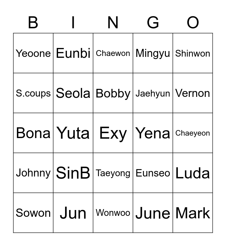 This bingo card has a free space and 24 words: Sowon, SinB, Bobby, June, Shinwon, Yeoone, Eunbi, Chaewon, Yena, Chaeyeon, Bona, Seola, Eunseo, Luda, S.coups, Jun, Wonwoo, Mingyu, Vernon, Johnny, Yuta, Taeyong, Jaehyun and Mark.