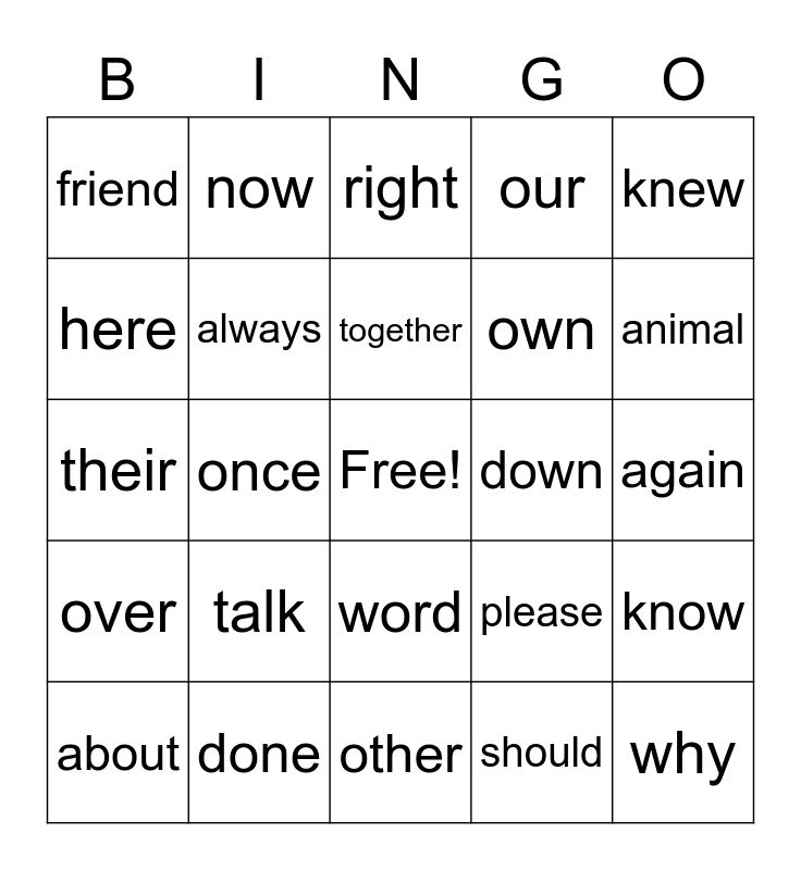 This bingo card has a free space and 32 words: should, sure, once, used, over, always, knew, know, now, being, together, right, house, said, down, could, about, their, word, talk, please, where, again, done, why, our, own, here, friend, other, another and animal.