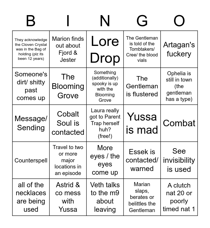 This bingo card has a free space and 29 words: all of the necklaces are being used, Eiselcross, Cobalt Soul is contacted, Scrying on the Tomb Takers, They acknowledge the Cloven Crystal was in the Bag of holding (plz its been 12 years), Lore Drop, The Blooming Grove, Travel to two or more major locations in an episode, Yussa is mad, Astrid & co mess with Yussa, Combat, A clutch nat 20 or poorly timed nat 1, Veth talks to the m9 about leaving, Marian slaps, berates or belittles the Gentleman, Ophelia is still in town (the gentleman has a type), Dream sequence, More eyes / the eyes come up, Counterspell, Artagan's fuckery, Message/ Sending, Essek is contacted/ warned, Divine Intervention, The Gentleman is flustered, Someone's dirt/ shitty past comes up, The Gentleman is told of the Tombtakers/ Cree/ the blood vials, Marion finds out about Fjord & Jester, See invisibility is used, Something (additionally) spooky is up with the Blooming Grove and Pumat!.