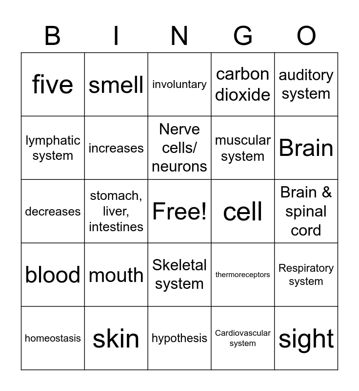 This bingo card has a free space and 26 words: Skeletal system, Cardiovascular system, Nerve cells/ neurons, skin, auditory system, five, lymphatic system, smell, Brain & spinal cord, thermoreceptors, muscular system, decreases, Respiratory system, homeostasis, stomach, liver, intestines, ear, carbon dioxide, blood, involuntary, sight, Brain, hypothesis, cell, mouth, increases and sweat.