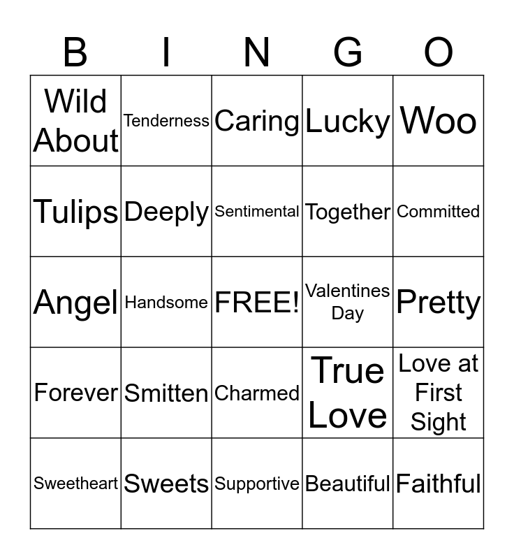 This bingo card has a free space and 24 words: Smitten, Sweets, Sentimental, Sweetheart, Woo, Wild About, Tulips, Tenderness, Valentines Day, Charmed, Together, Angel, True Love, Love at First Sight, Deeply, Beautiful, Pretty, Caring, Committed, Handsome, Faithful, Forever, Lucky and Supportive.