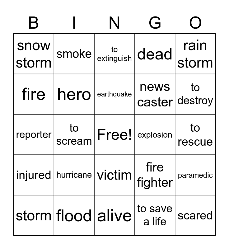This bingo card has a free space and 24 words: hurricane, flood, earthquake, storm, rain storm, snow storm, fire, smoke, explosion, victim, news caster, reporter, fire fighter, paramedic, hero, to save a life, to rescue, to extinguish, to destroy, to scream, scared, injured, dead and alive.