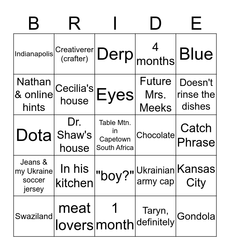 This bingo card has a free space and 24 words: In his kitchen, meat lovers, Eyes, Swaziland, Blue, Indianapolis, Nathan & online hints, Creativerer (crafter), Chocolate, "boy?", Future Mrs. Meeks, Dota, Ukrainian army cap, Kansas City, Cecilia's house, Taryn, definitely, Catch Phrase, Derp, Doesn't rinse the dishes, Dr. Shaw's house, Gondola, Jeans & my Ukraine soccer jersey, 4 months and 1 month.