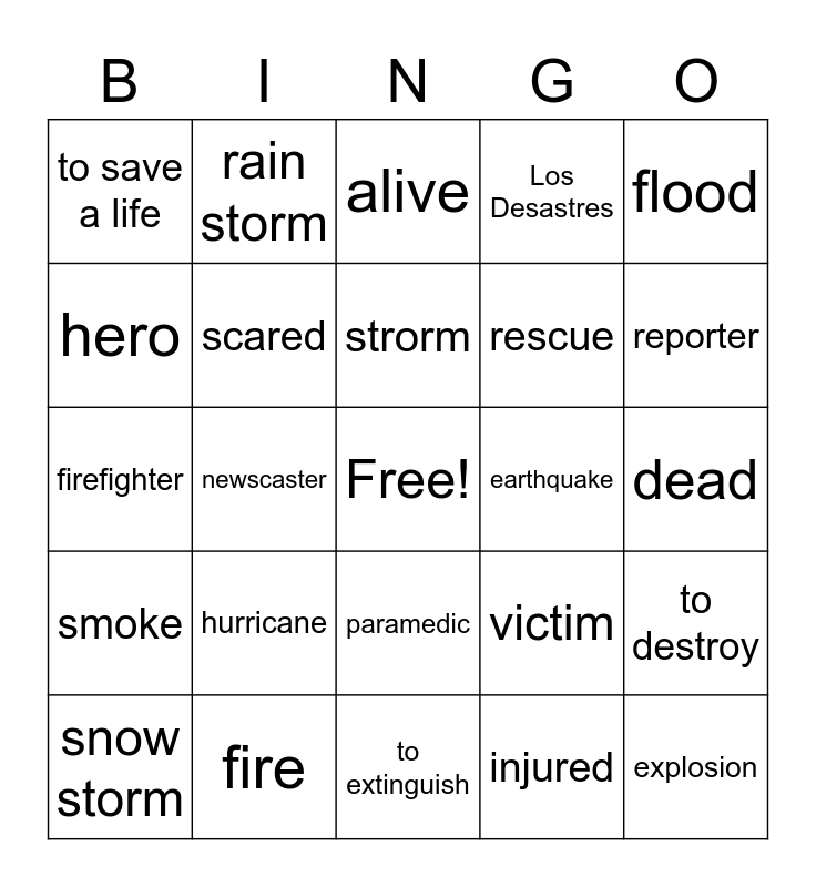 This bingo card has a free space and 24 words: hurricane, fire, strorm, snow storm, flood, to save a life, hero, rain storm, earthquake, paramedic, rescue, firefighter, victim, to destroy, scared, injured, dead, alive, reporter, newscaster, explosion, smoke, Los Desastres and to extinguish.