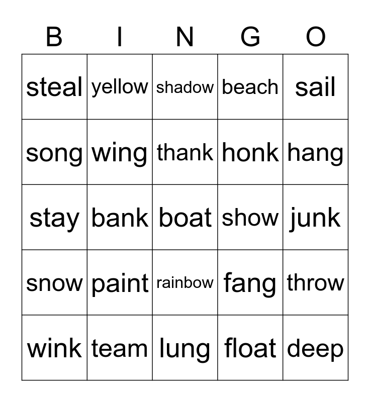 This bingo card has 25 words: snow, team, boat, float, sail, steal, yellow, shadow, show, throw, song, wing, lung, fang, hang, wink, bank, thank, honk, junk, stay, paint, rainbow, beach and deep.