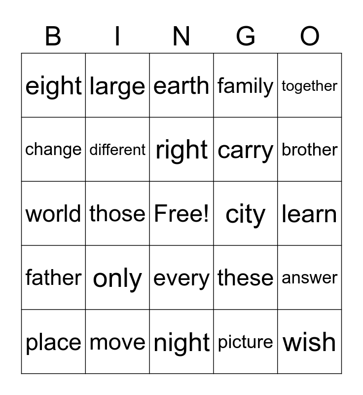 This bingo card has a free space and 24 words: only, move, right, place, together, eight, change, large, city, every, carry, world, these, answer, different, picture, learn, earth, brother, those, wish, father, family and night.