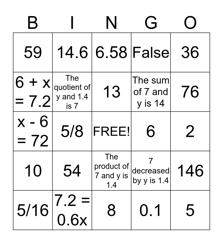 This bingo card has a free space and 24 words: 54, 7.2 = 0.6x, 13, 5/16, 36, 59, 6 + x = 7.2, 14.6, 6, The product of 7 and y is 1.4, The sum of 7 and y is 14, x - 6 = 72, 7 decreased by y is 1.4, 146, The quotient of y and 1.4 is 7, 0.1, 2, 6.58, 76, 5/8, 5, 10, False and 8.