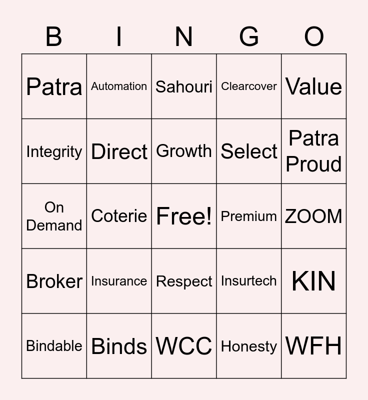 This bingo card has a free space and 24 words: Bindable, Insurance, Growth, Honesty, Value, Patra, Automation, Sahouri, Premium, ZOOM, On Demand, Direct, Insurtech, KIN, Integrity, Binds, WCC, Clearcover, Patra Proud, Broker, Coterie, Respect, Select and WFH.