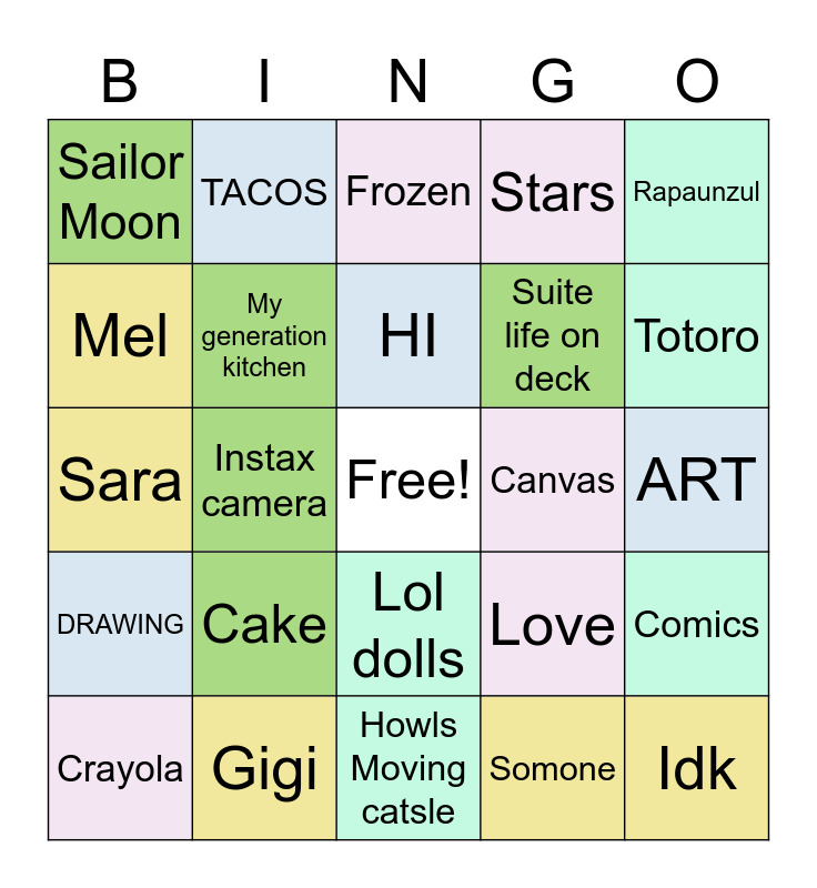 This bingo card has a free space and 24 words: Cake, Gigi, HI, Crayola, Rapaunzul, Sailor Moon, Mel, TACOS, Canvas, Lol dolls, Suite life on deck, Sara, Love, Comics, My generation kitchen, Somone, ART, Frozen, Totoro, Instax camera, Idk, DRAWING, Stars and Howls Moving catsle.